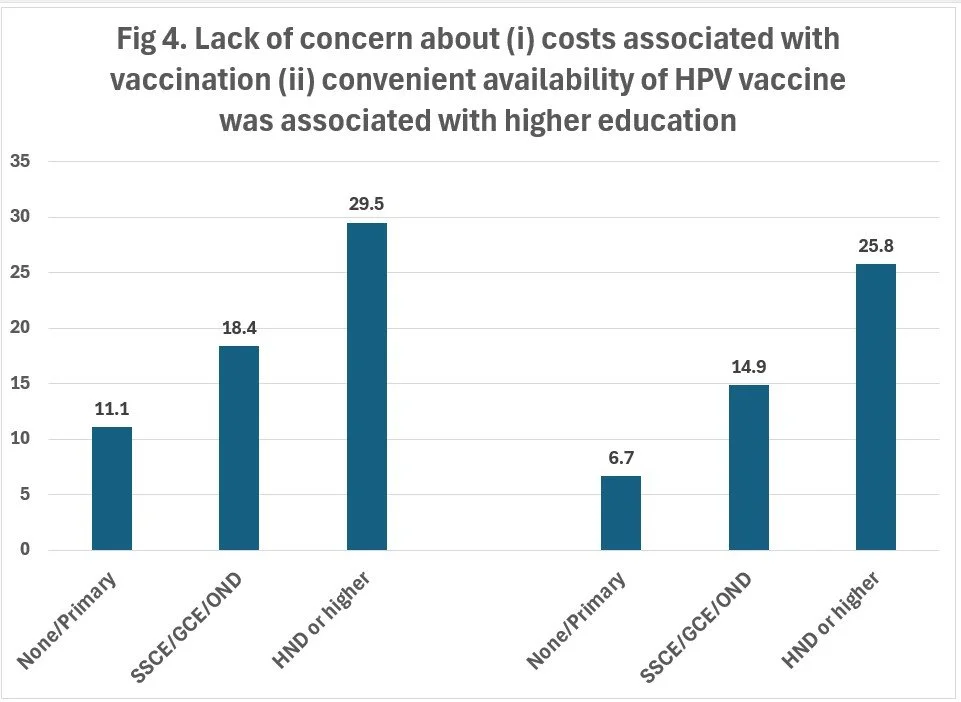 Figure 4 shows that educated caregivers were less concerned about the costs or convenient availability of the HPV vaccine. These findings may reflect deeper socio-economic differences: caregivers with greater education or financial resources may experience fewer barriers in practice—or perceive them differently. Addressing vaccine access and affordability is crucial, as is understanding the broader inequities that shape these perceptions.