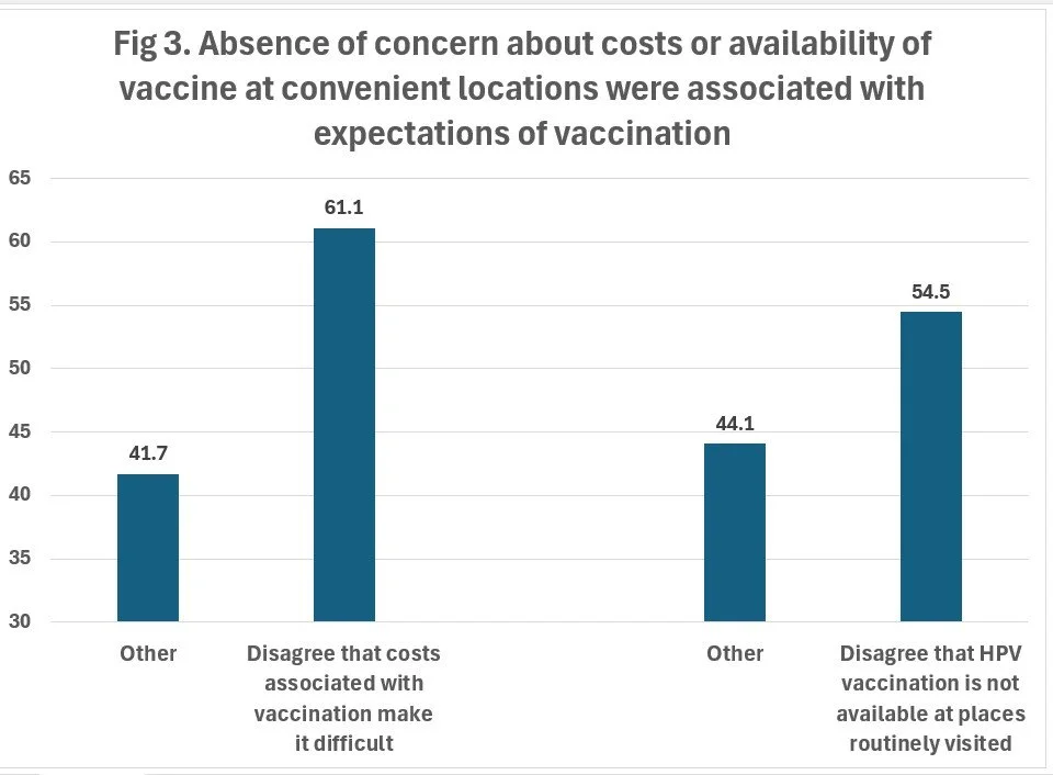 Structural factors play a key role in shaping vaccination expectations, as shown in Figure 3. Caregivers who were not concerned about the costs associated with HPV vaccination were far more likely to expect that their child would get vaccinated—61% versus 42%. Similarly, those who felt that the HPV vaccine was available at places they routinely visited reported higher expectations of the child getting vaccinated (55% vs. 44%). These findings highlight how reducing financial and logistical barriers can meaningfully shift caregiver expectations regarding their child’s vaccination.