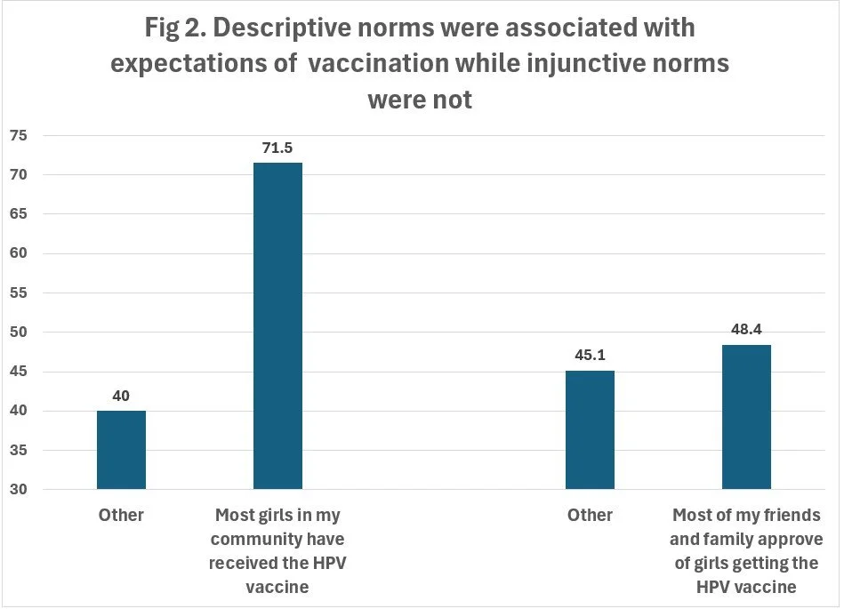 Figure 2 shows that social norms were the most powerful predictor of caregivers’ expectations regarding their adolescent’s vaccination. When caregivers believed that most girls in their community had received the HPV vaccine (a descriptive norm reflecting caregivers’ perceptions of what others are doing), they were 32 percentage points more likely to expect that their child would be vaccinated. Interestingly, perceived community approval of HPV vaccination (an injunctive norm reflecting caregivers’ perceptions of what others think should be done) - which we found to be influential in earlier data collected in 2024 - no longer predicted caregiver expectations of the child getting vaccinated. This shift underscores the importance of what caregivers think others are doing, rather than what they think others expect them to do, in shaping behavior.